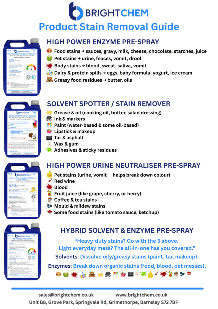 When it comes to tackling stubborn stains and heavy soiling, knowing which product to reach for can make all the difference. BrightChem’s specialist solutions are designed to target specific soil types, ensuring a cleaner, fresher, and more professional finish every time.