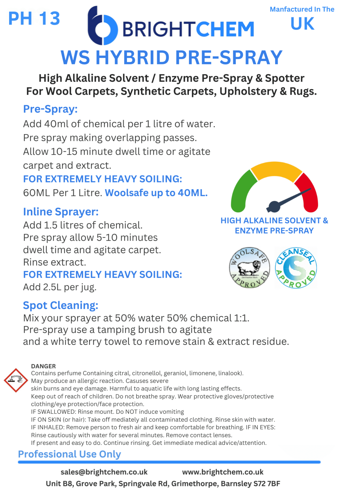 BrightChem WS Hybrid Pre-Spray is a professional-grade hybrid formula designed for tough commercial and residential cleaning. Combining the power of enzymes and solvents, it delivers superior cleaning results on all soil types – from everyday dirt to deeply embedded grease and protein-based soiling.